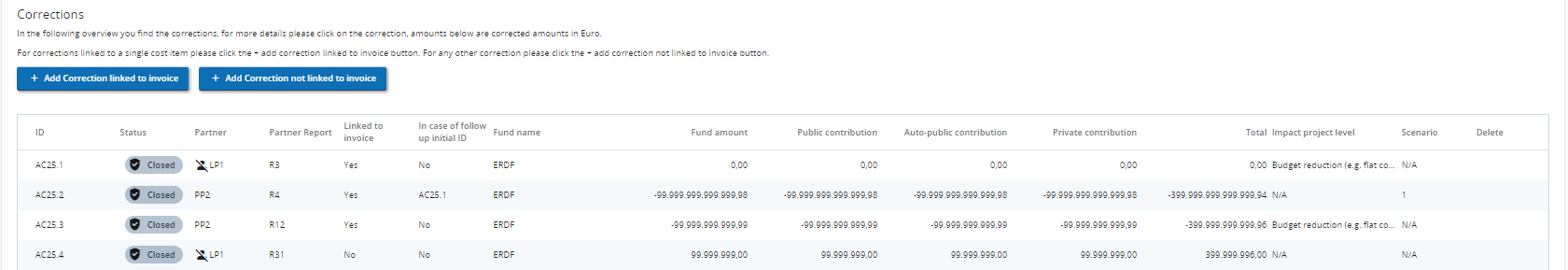 In this section the corrected amount should be indicated in Euro. What is important to note is that there are no automatic calculations made in this section. The user should therefore make sure that the co-financing rates of the partner are respected.