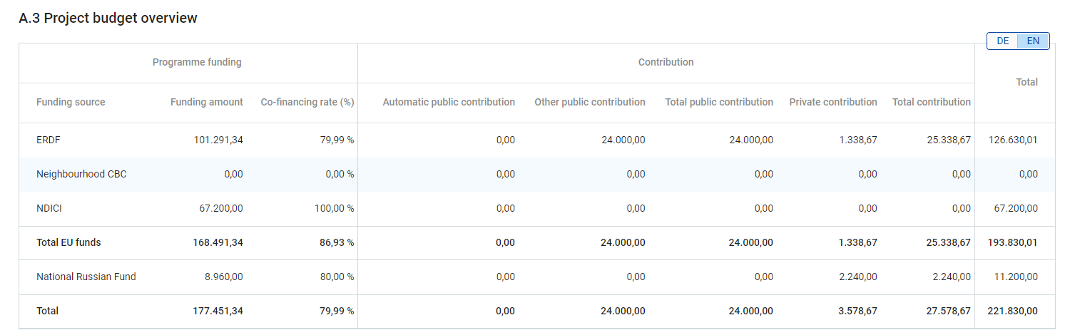 Table A.3 displays the project budget per fund including the contribution. Its purpose is to provide a clear budget overview in section A. All pre-defined EU funds are added to the Total EU funds. All other funds are added to the total as per image below.