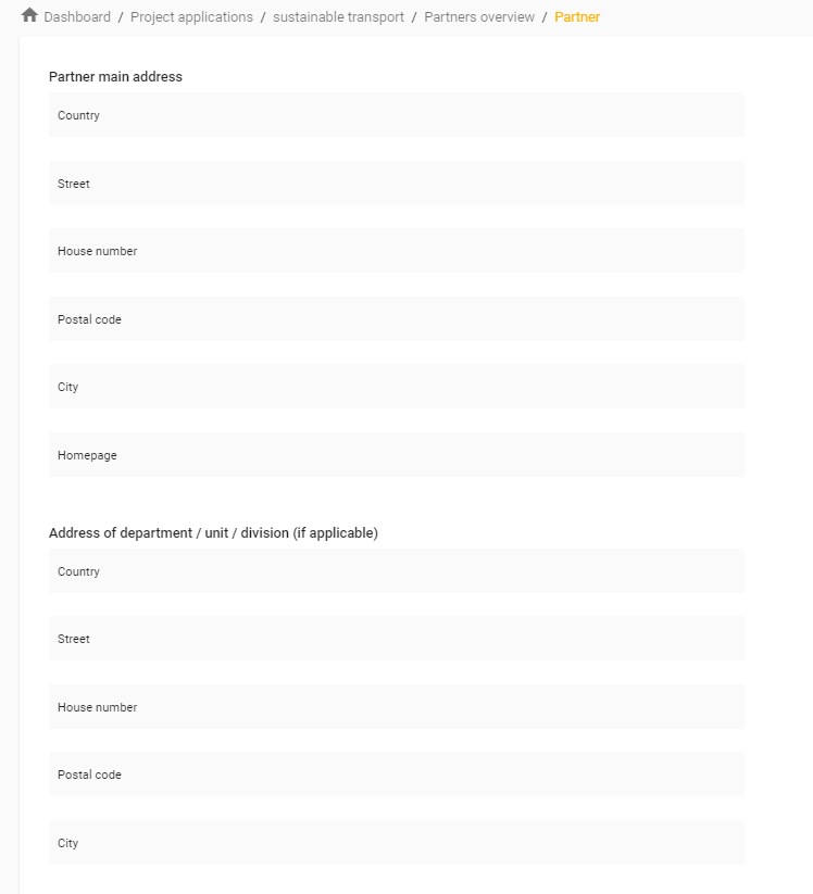 In the Address section, the applicant is asked to fill in the partner main address and address of the department/unit/division (if applicable).