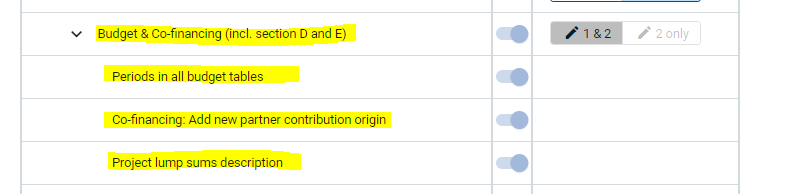 For the section Budget & Co-financing incl. section D and E, there are specific configuration options available:
