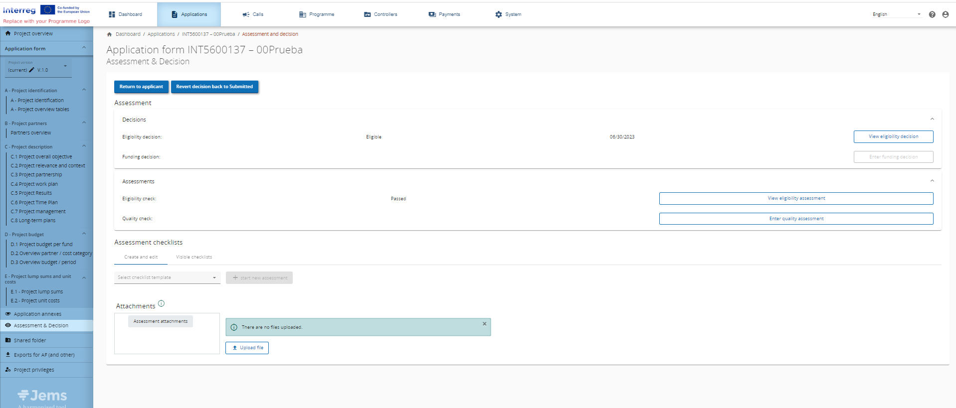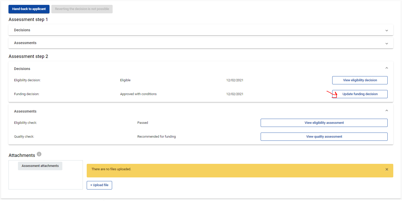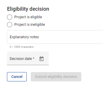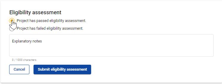 Entering the result of the eligibility assessment is recorded in the system and cannot be changed or undone. However, this does not change the status of the project application.