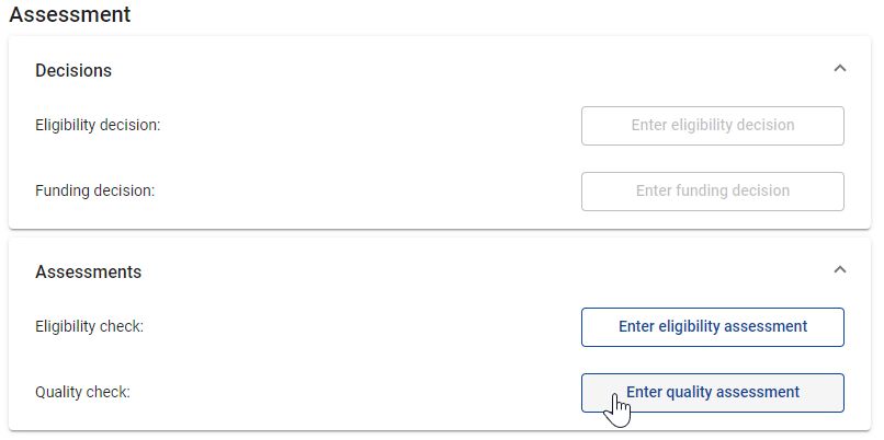 Then the decision of the respective assessment can be entered as well. The eligibility decision (concluding the eligibility assessment) has to be entered before the funding decision (concluding the quality assessment).
