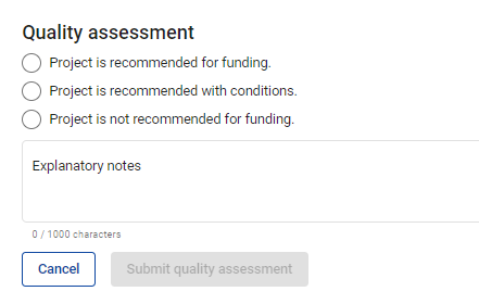 Entering the result of the quality assessment is recorded in the system and cannot be changed or undone. However, this does not change the status of the project application.