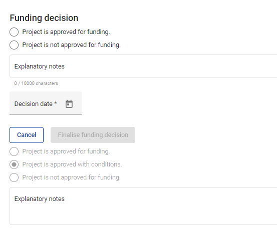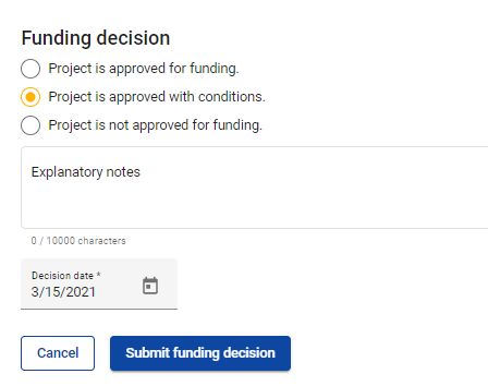 As a final decision, a project can be either approved or not approved for funding. Explanatory notes are optional.