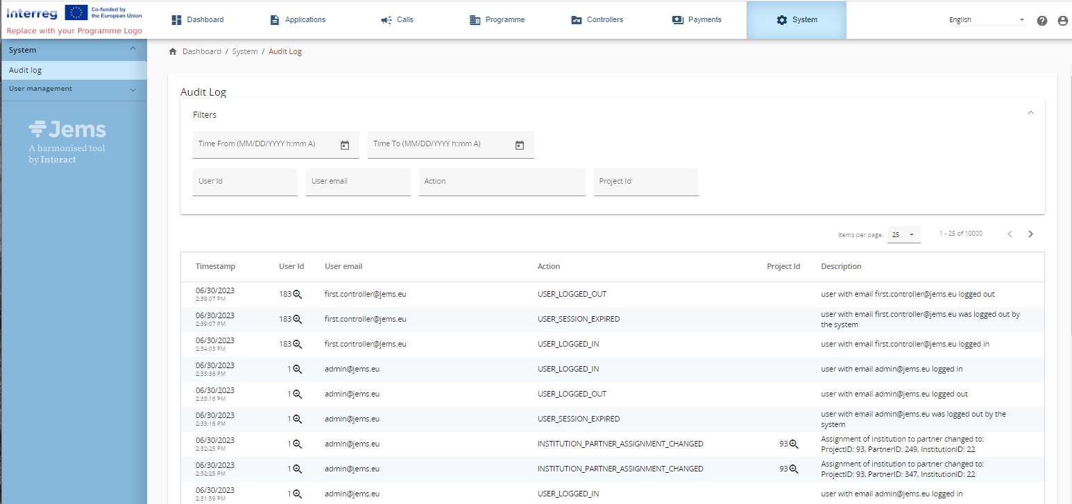 Follow table gives a quick look of what is expected from each audit log activity (for quick reference). It is possible that some audit activities are not yet implemented in your version of Jems and there’s also the possibility that some activities get deprecated (e.g. the audit information was re-organized into different activities) - A future stage with less intense developments on Jems will imply a stable audit_log entries definition (permanent).