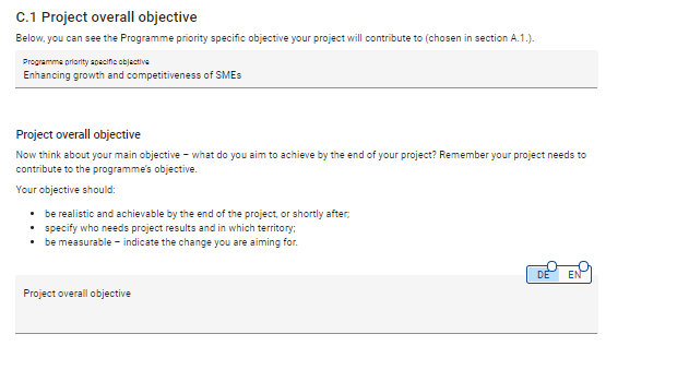In section C1, the Programme priority specific objective chosen in Section A1 is shown and the applicant is requested to describe the Project overall objective.