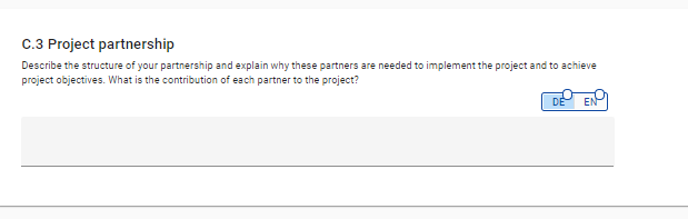 In this section, the project shall further describe the structure of the partnership through a free text input question.