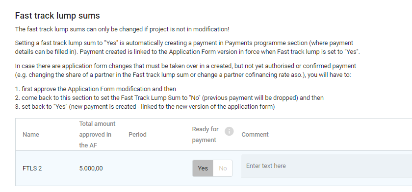 In case there are Application form changes that must be taken over in a created, but not yet authorised or confirmed payment (e.g. changing the share of a partner in the Fast track lump sum or change a partners cofinancing rate), user will have to come back to this section after application form modification is approved and set the Fast track lump sum to No (previous payment will be dropped) and then set it back to Yes (so that a new payment is created - linked to the new version of the application form).