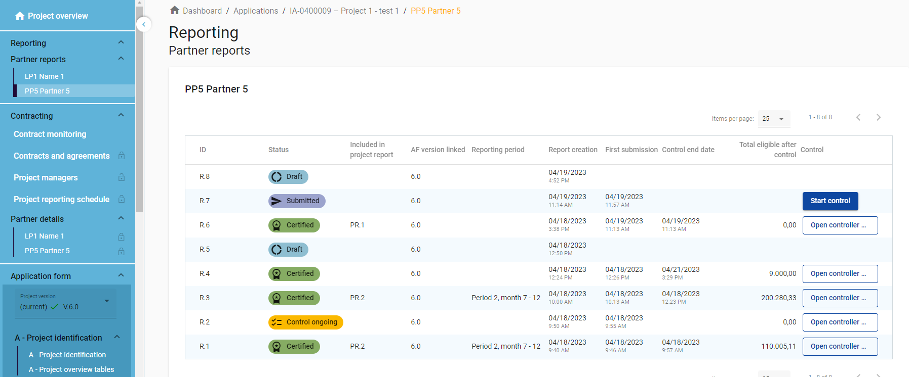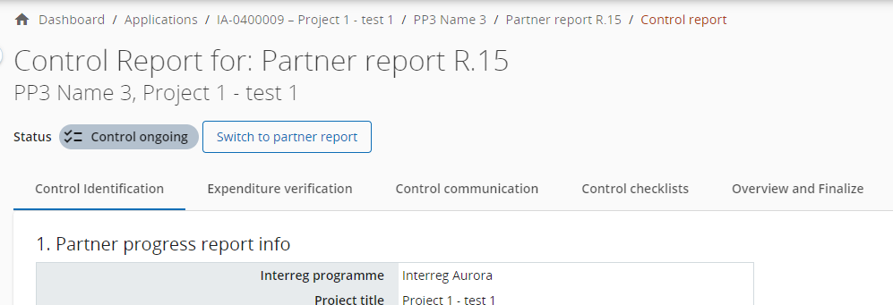 Controllers with Edit right belonging to the control institution assigned to a partner (see Controllers ) can start, fill in and finalize the control work for a Submitted partner report.