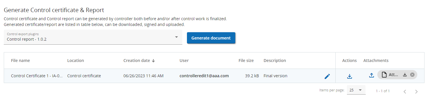 Generated files are displayed in a list and can be downloaded anytime by any user with access to this tab. In this list, controllers with EDIT permission can also upload an attachment (e.g. signed control report) per generated file. The deletion of the uploaded attachments is blocked once the control is finalized.