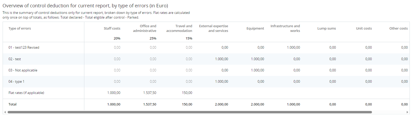 This table sums up deductions applied to this report from the Expenditure verification list and displays also related flat rates (in Flat rates row) calculated according to the partner budget rounding settings. Same calculation rule applies as the one used for deducted amounts in table above.