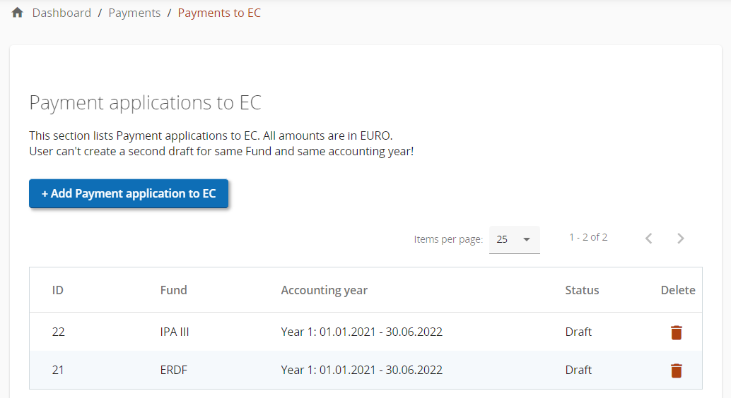 After creation of a Payment application to EC, the selected fund and the selected accounting year cannot be changed anymore. A draft Payment application to EC can be deleted.