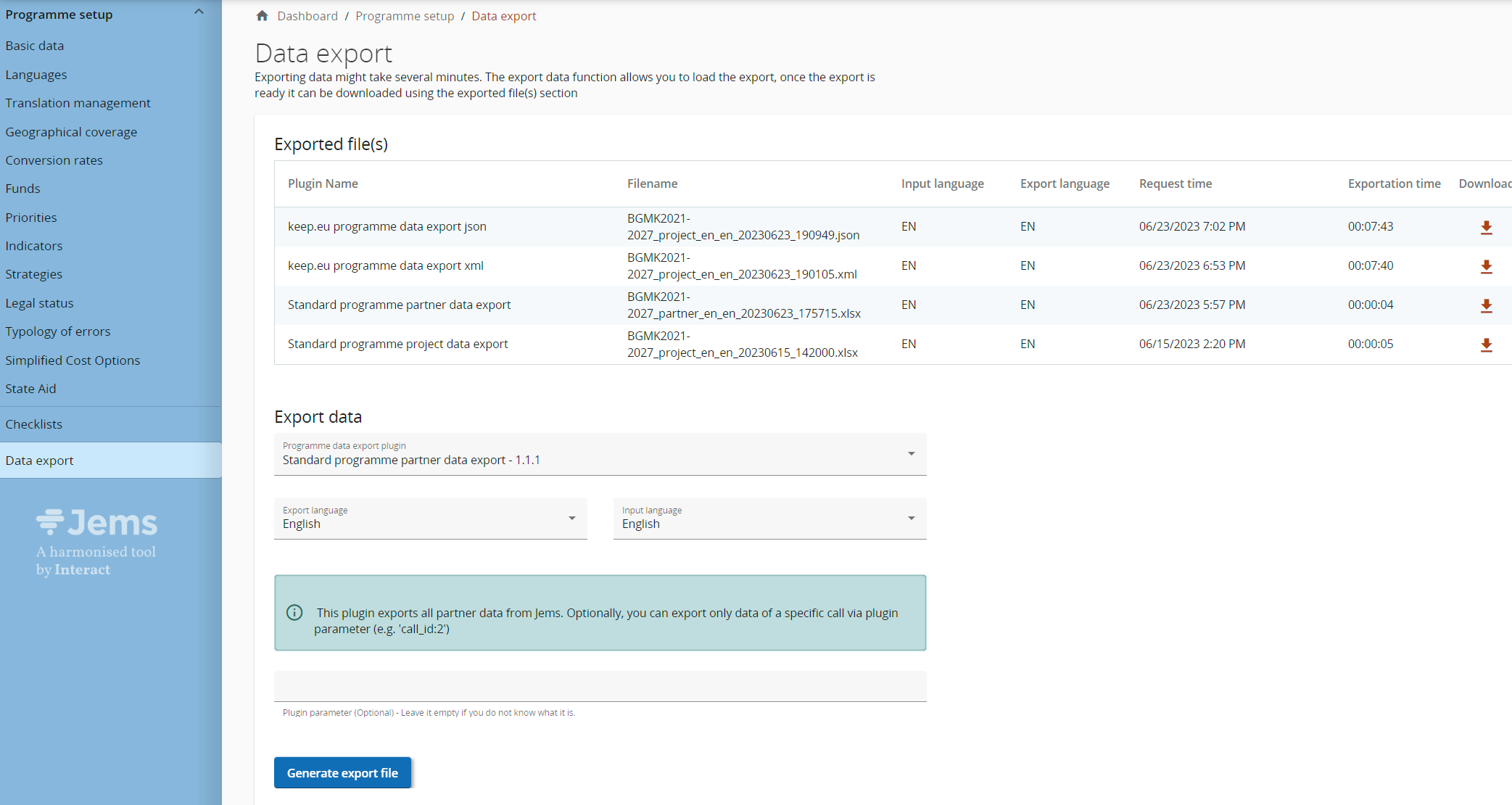 Standard Jems plugin export excel files that can be used to do any analysis and statistical calculations outside of the system. In the system one can use the selector to define the language that the user would like to export and then generate a file. After clicking the Generate export file button the data starts loading and the loading lasts at least 1 minute. Once the data is loaded the download button in the Exported file(s) table becomes available.