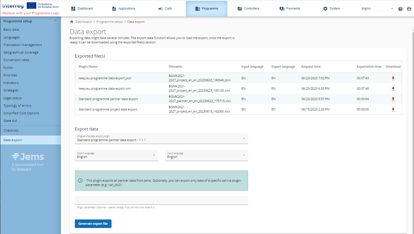 In this section a programme can extract data from the entire system via programme-export addons (e.g. standard Jems plugin, programme developed plugin, keep.eu etc…).