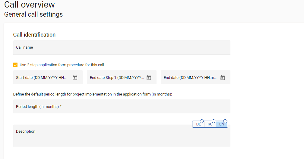 The call identification includes general parameters like call name and call description (in all system languages) as well as the start and end date of the call. Also, the default period length can be defined.