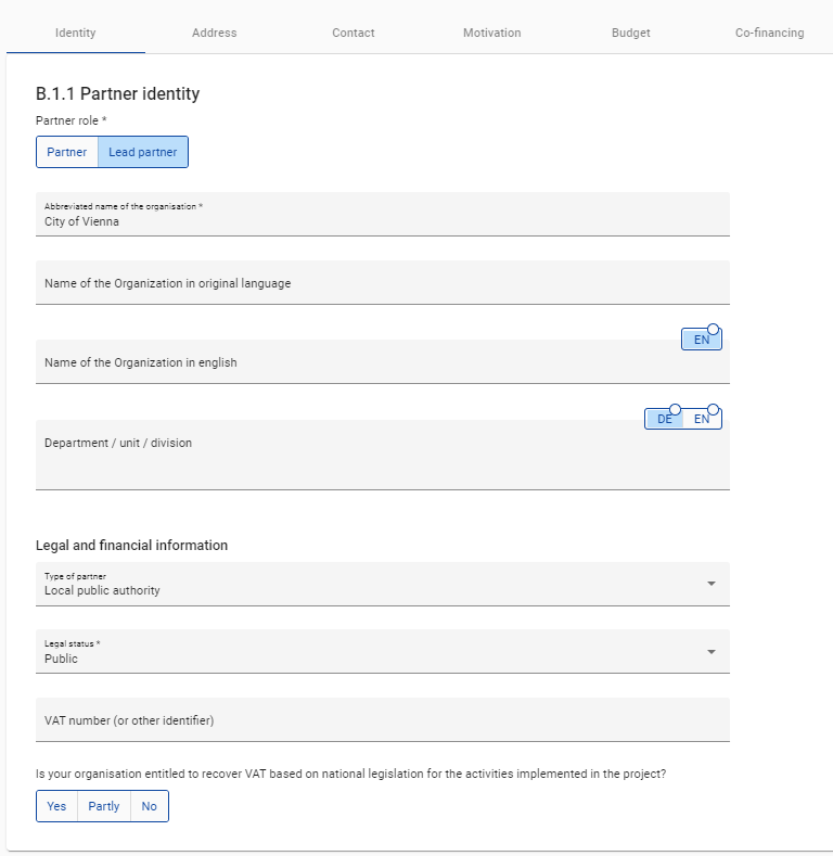 The Partner identity section is used to identify the partner organisation with basic details.
