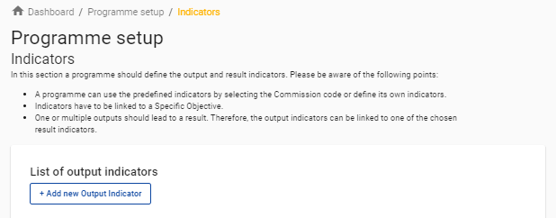 The button “+ Create output indicator” allows you to add Output indicators to the system and redirects you to the Output indicator form.