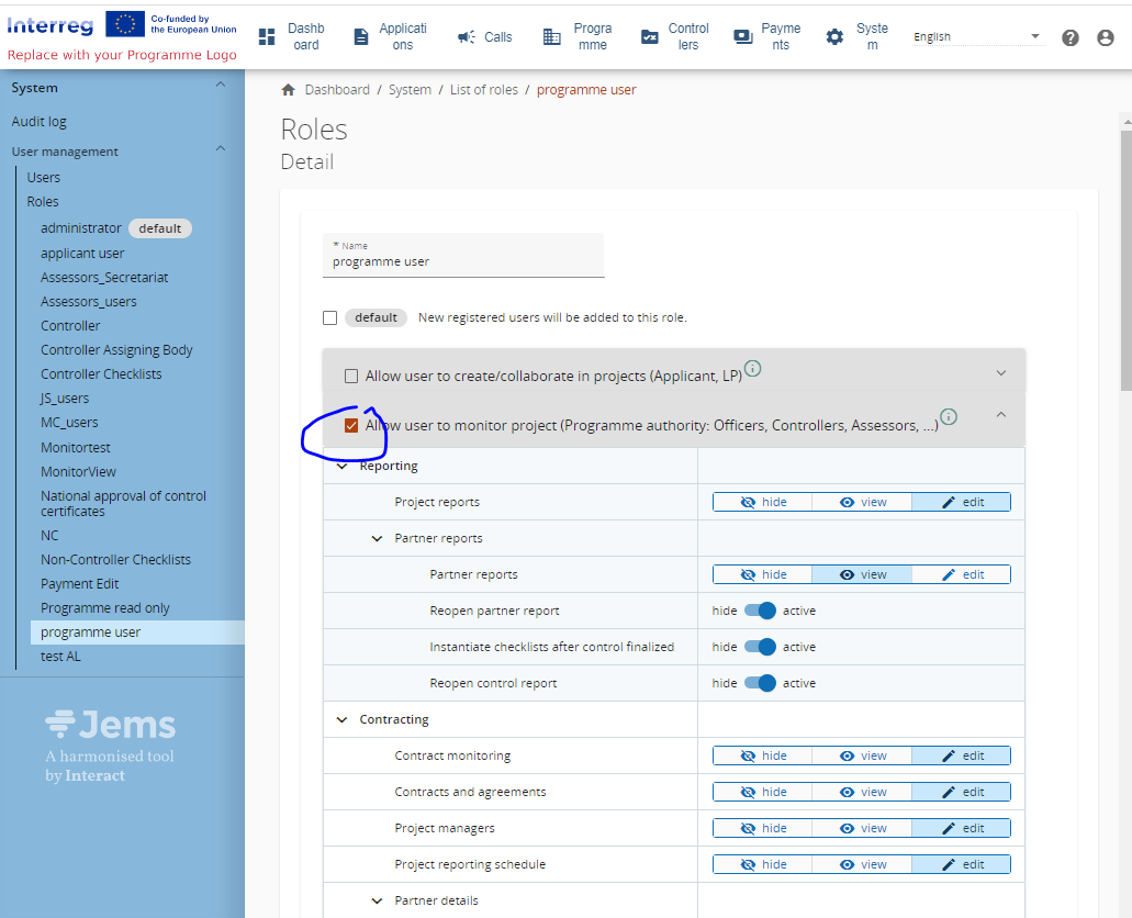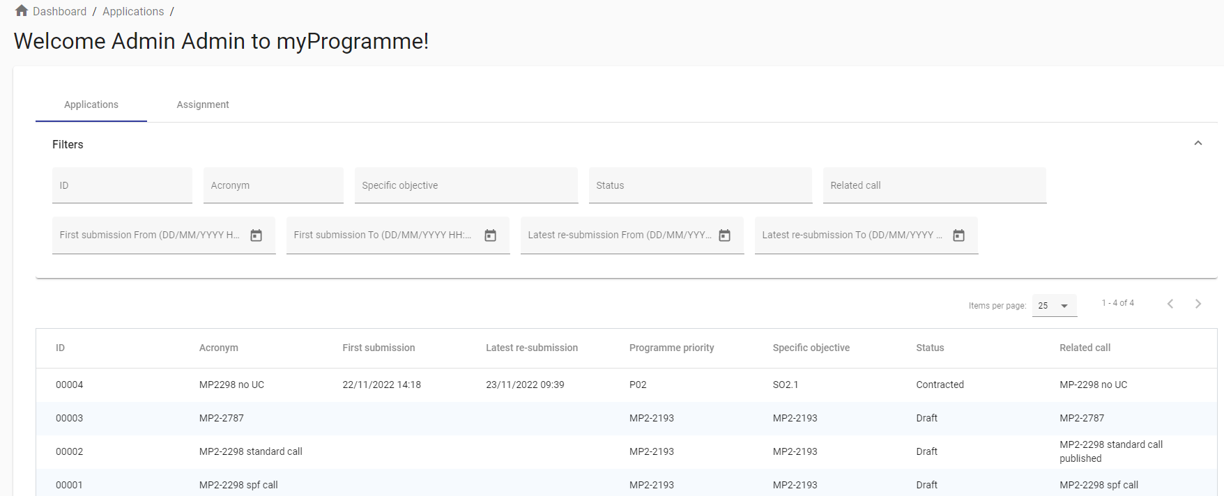 In the tab Applications all possible applications/projects are shown (i.e from status draft), the table is clickable and will direct immediately the user to the project selected - What a user can see or do in a project does not depend on what privileges the user has for the Application section, but for the page the user is currently in (all webpages/sections of Jems have specific system privileges configured for his role).