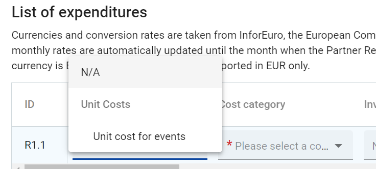 Unit costs and Lump sums from the Last approved Application Form are added to this dropdown (Fast track lump sums are not reported and therefore not showing up here). When choosing Unit cost or Lump sum item in the dropdown, some cells are automatically filled-in and locked. For a real cost item N/A (pre-filled as default option) shall be chosen.