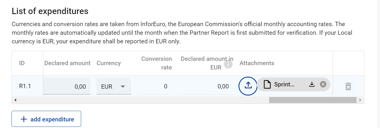 Exchange rates are applied when expenditure items in other currencies than Euro are declared. If a report is in draft, exchange rates are updated constantly. Once a report is submitted, the exchange rates shall be taken from the month of submission and frozen.