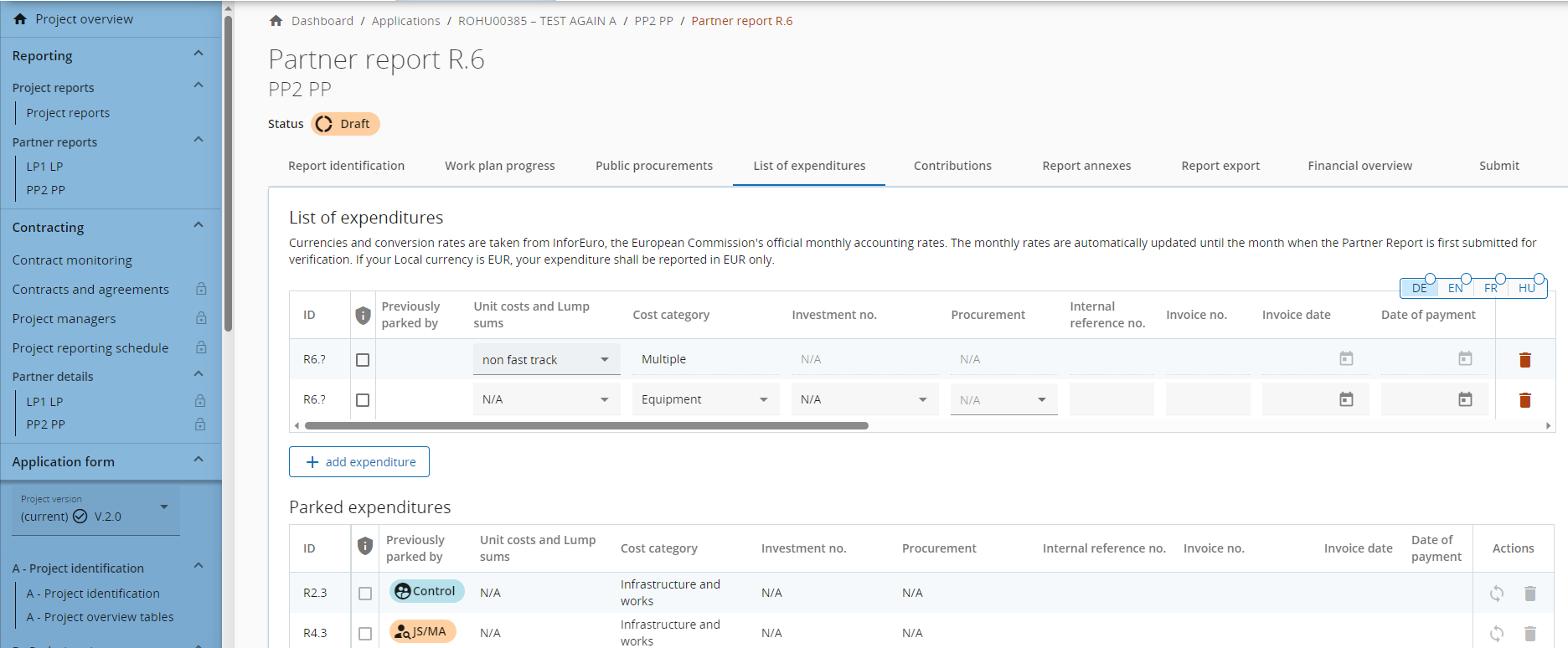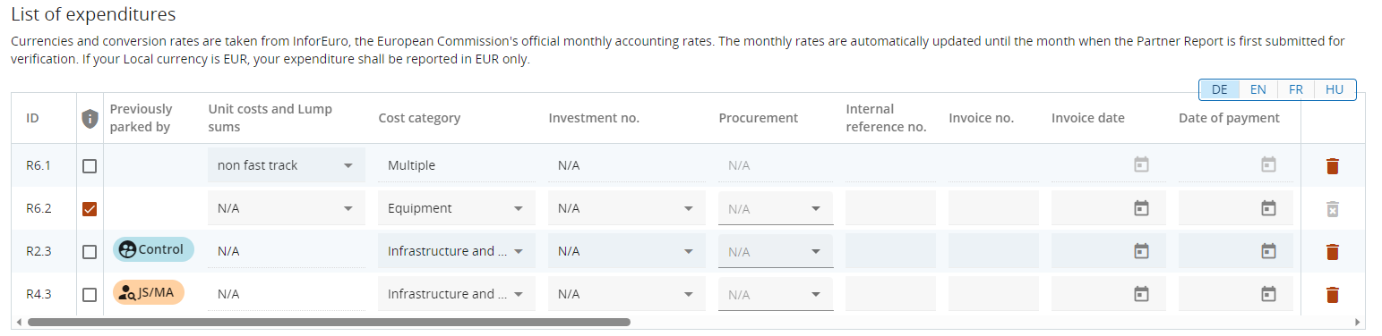 In case a controller/programme user parked some items in control/verification of project report, they show up in the Parked expenditure section in the List of expenditure.