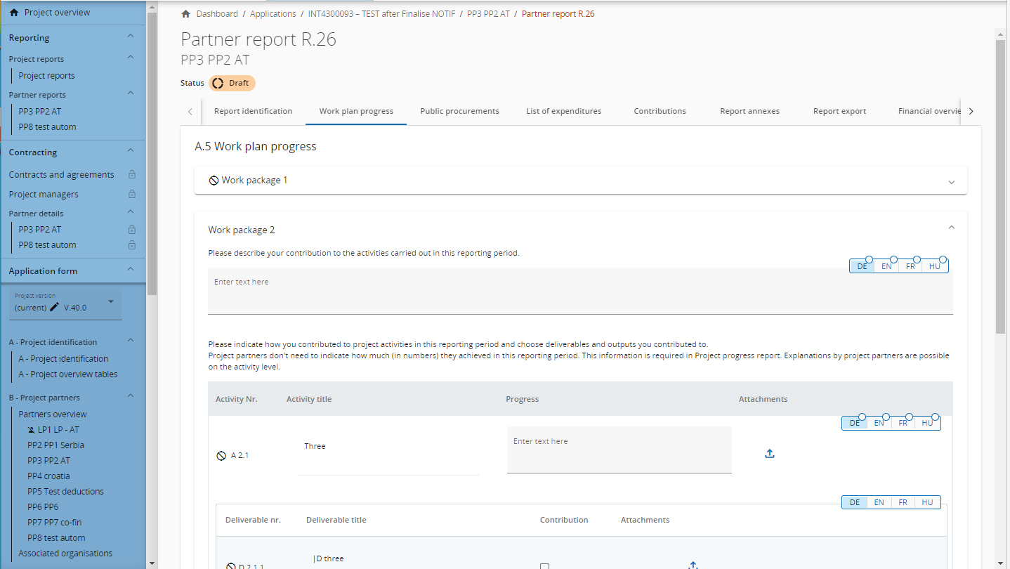 Partners describe the progress on certain work packages, objectives, Investments, activities, deliverables and outputs and indicate if they contributed. (Later, at project report level the Lead partner shall fill in values achieved). Partner users can also upload an attachment per item which will show up again in the partner report Annexes.