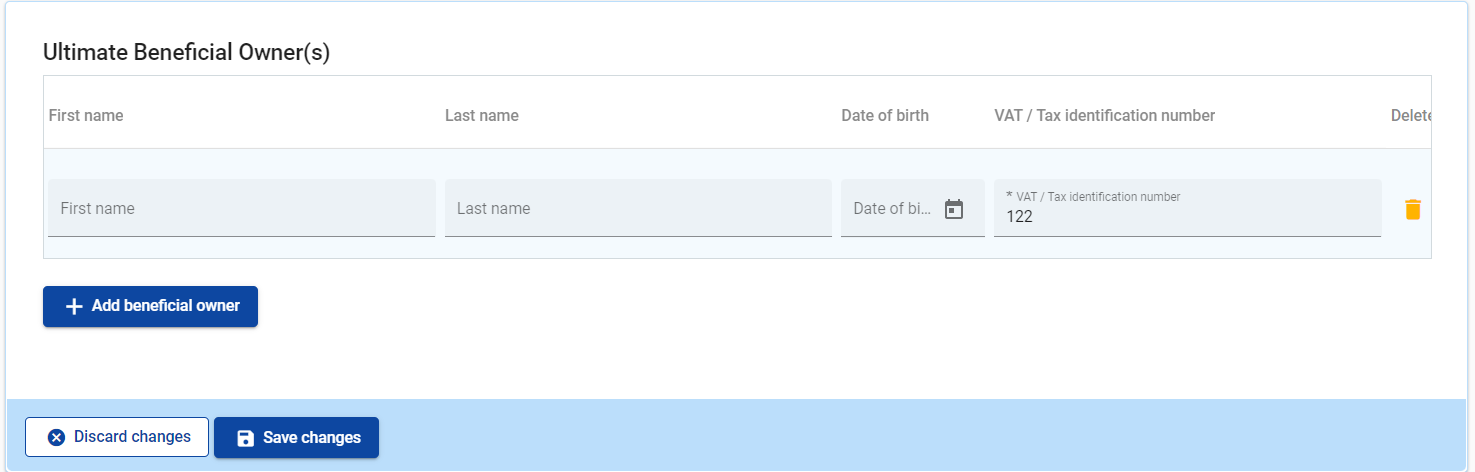 In line with the CPR (Common Provision Regulation), partner organisation(s) could be required to fill-in the Ultimate Beneficial Owner(s) of their organisation. The fields required by the regulation are: First name, Last name, Date of Birth, VAT/Tax identifier. Partners have the possibility to add this information in their partner section, in case this is required.