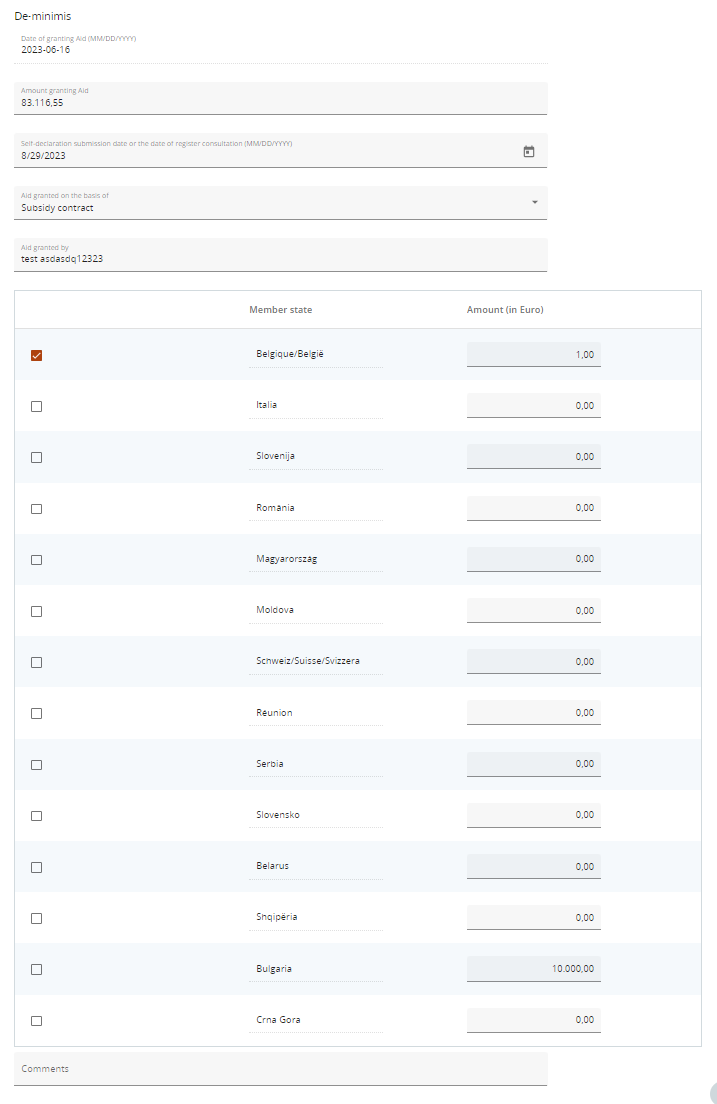 In case the partner declared to mitigate state aid through De minimis the following fields show up. The data pre-filled come from the AF or from the programme setup (geographical coverage of the programme)