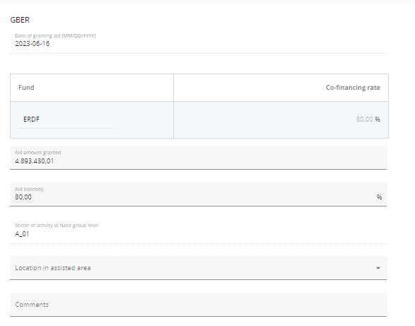 In case the partner declared to mitigate it’s state aid risk through a GBER scheme or any other scheme the following fields show up:
