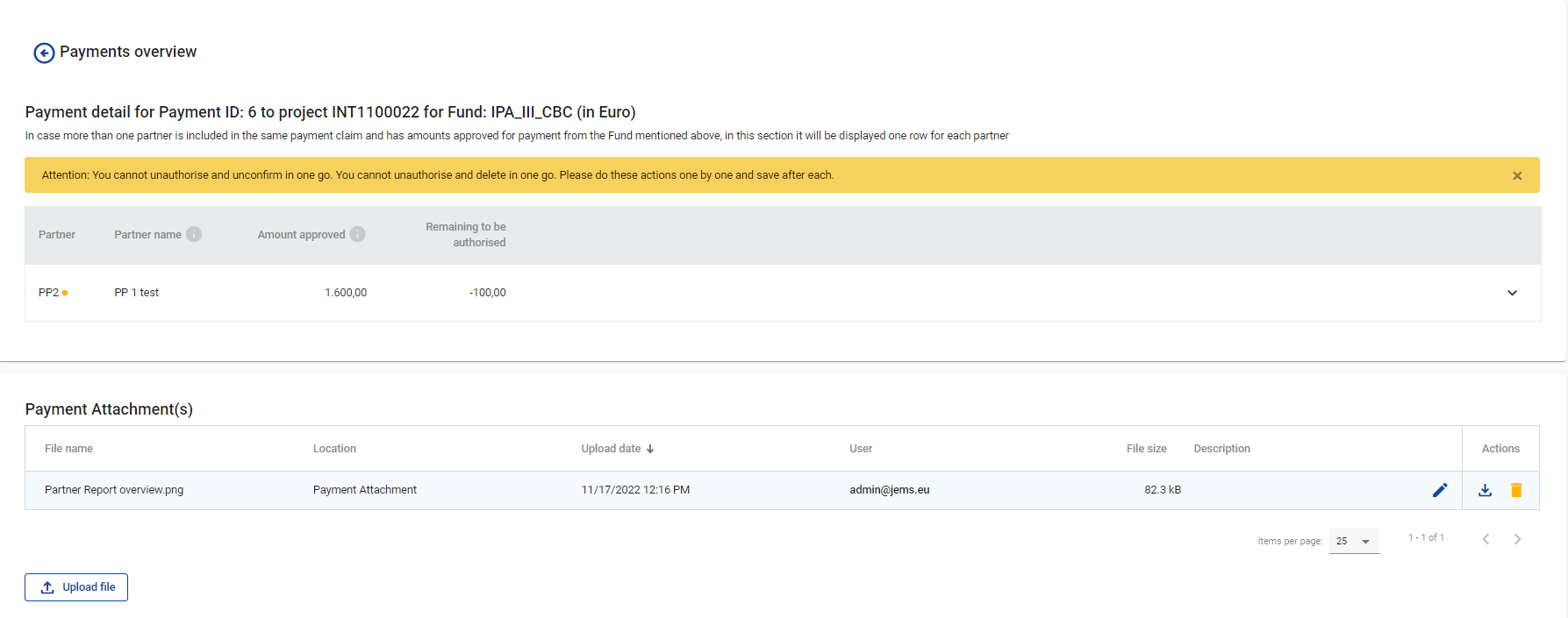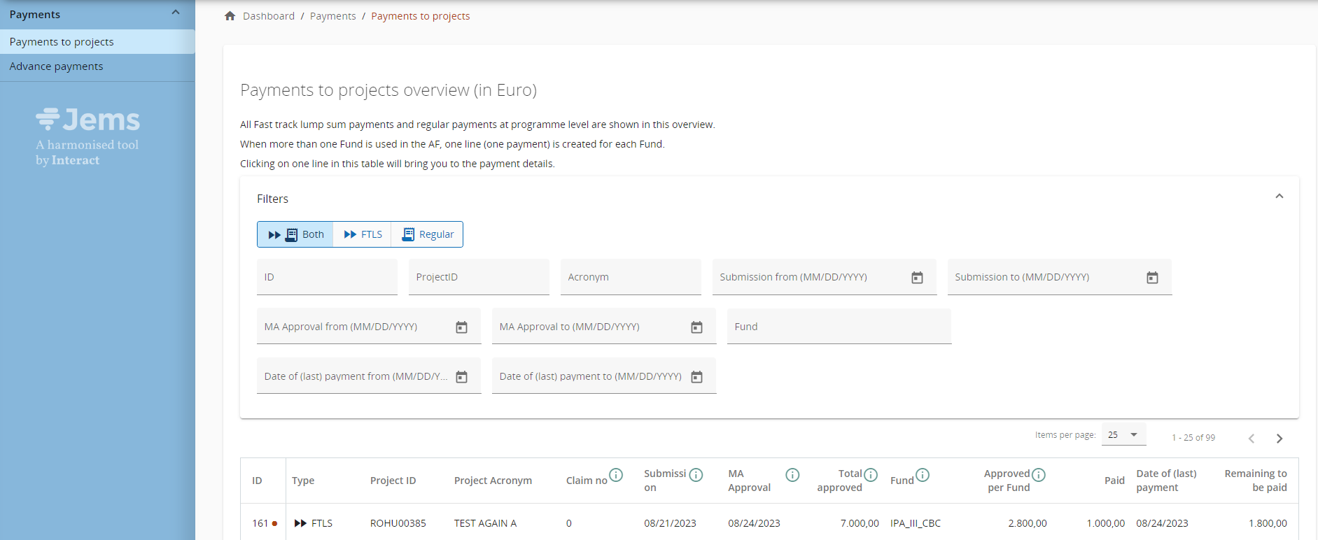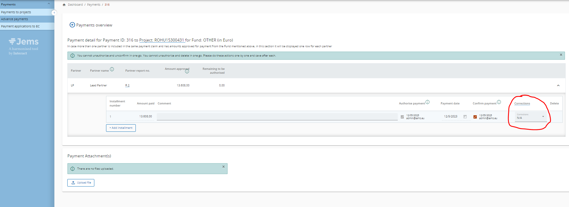 System allows for both checks - authorising officer and accounting officer - according to Financial Regulation and each of these 2 confirmations are also Audit Log entries in Jems. However, it is up to each programme to decide if both these officers operate in Jems in real time or if only one of them fills in payment info after payment is finalised.