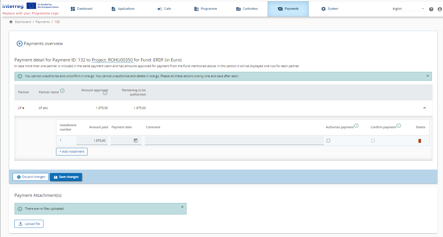 Programme user/Accounting officer has to fill in a Payment Date, can edit Comment field (optional) and can Confirm payment.