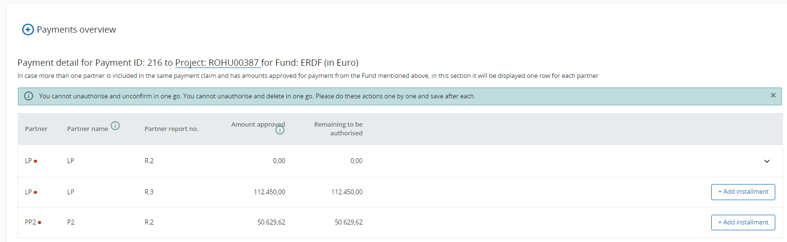In case more partners are involved in the payment claim for the Fund concerned by the respective payment item, one row is displayed in payment detail for each of them.