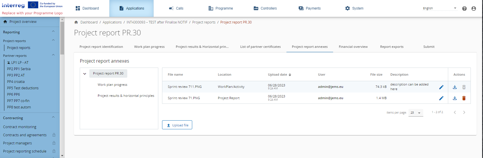 Project managers have the possibility to upload additional files linked to the Project report here (by clicking the Upload file button).