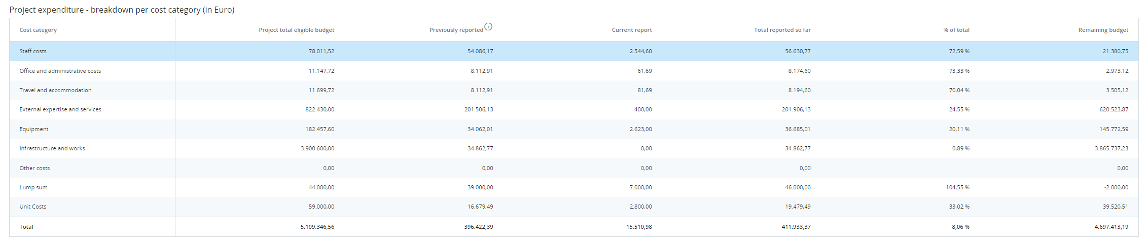 What is important to note is what is described in the info bubble: no Simplified cost items are added up to this table, as they are automatically calculated on top. Only real costs linked to the investment in the List of expenditure are displayed in this overview table.