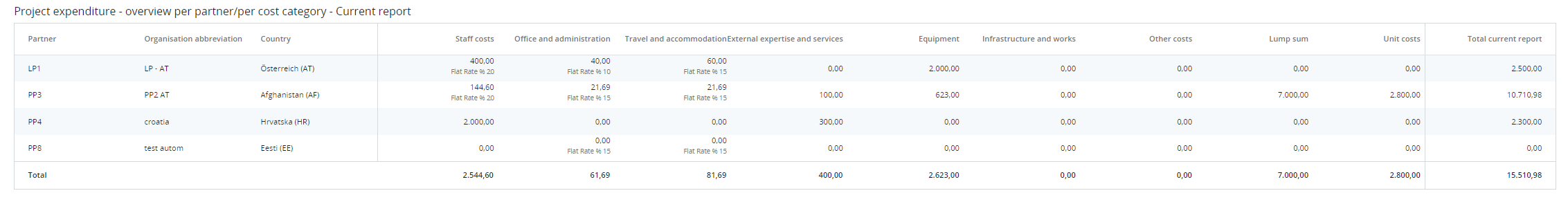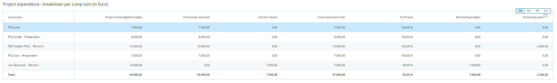 This table shows the Lump sums. Lump sums declared in the partner reports' list of expenditure show up in the Current report column.