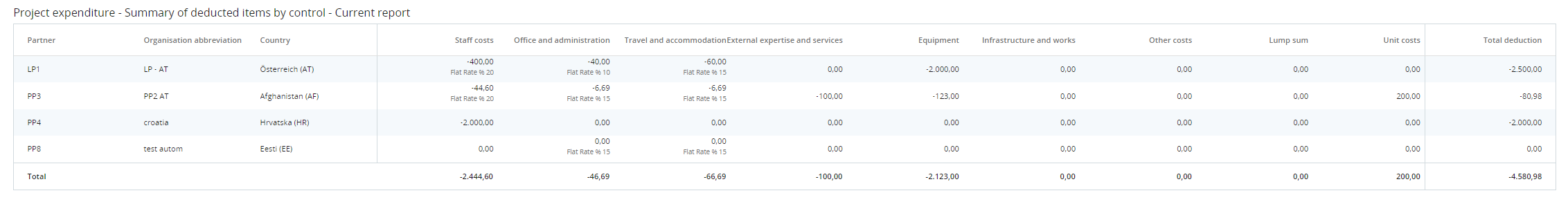 This table sums up all deductions carried out by control per partner and type of error. These values are not cumulative but only related to the certificates included in this report.