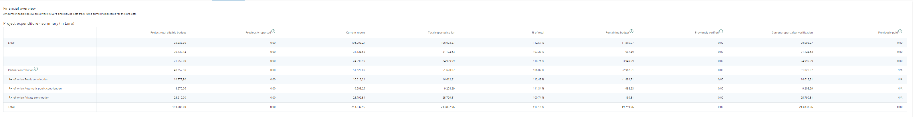 Remaining budget: This column indicates the difference between Total reported so far and Partner total eligible budget from the application form. This value can become negative in case the reported expenditures exceed the budget in approved application form.