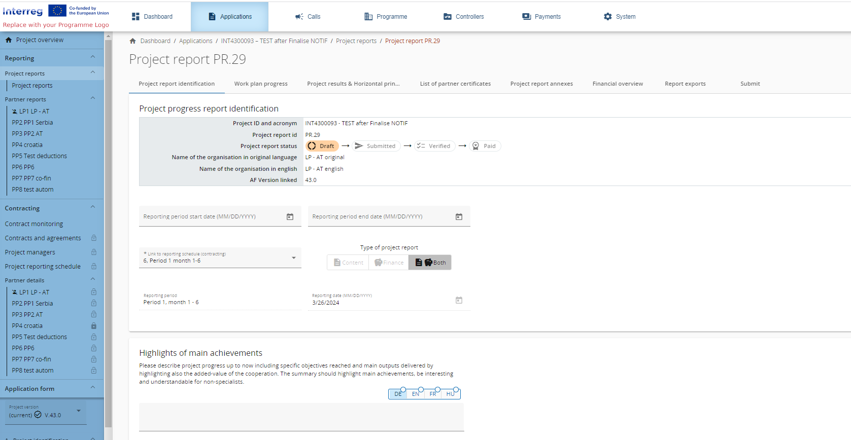The tab includes textboxes to describe the Highlights of main achievements and Partner problems and deviations. In addition, the tab includes the following overview tables as described below: