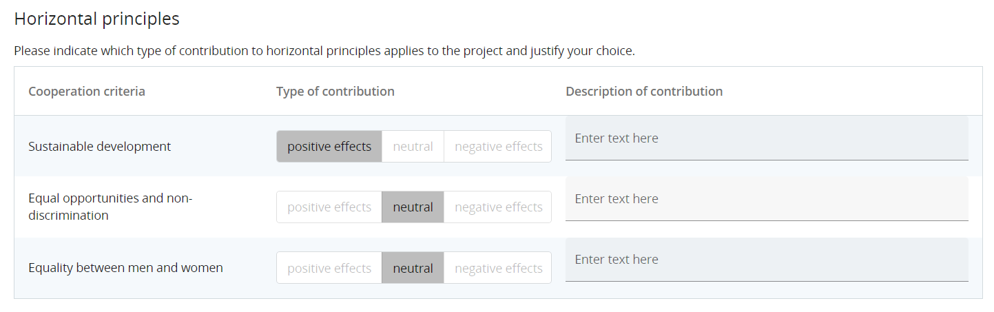 For Horizontal principles there is a table to report on the contribution for each of the three cooperation criteria. The Type of contribution is pre-defined from the latest approved application form and cannot be changed. There is a text field to describe the contribution made in the respective reporting period.