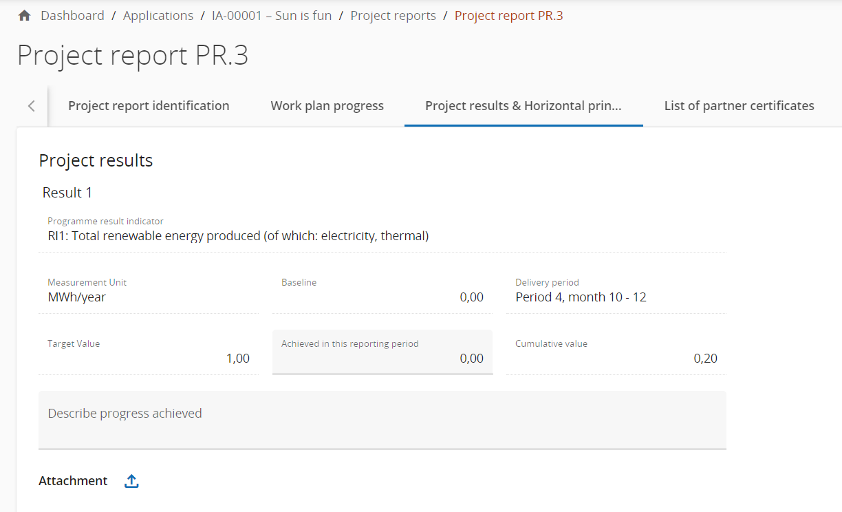 Results are cumulative, meaning that if a report is submitted and another report created the values from the previous report are added to the cumulative values. The cumulative value achieved is calculated as the sum of all the figures reported in all Project reports with the status submitted.