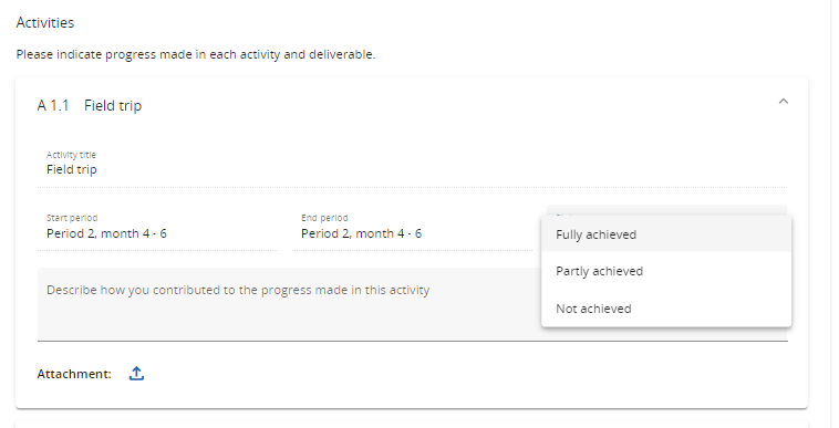 For each Investment, Activity, Deliverable and Output there is a separate section with text fields to describe the progress in the reporting period. Similar as for objectives, for each activity there is a field to define the Status.