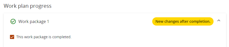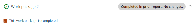 The same logic applies to the overall Work package completion. If a Work package was ticked as completed in a prior report, the label “Completed in prior report. No changes.” is shown at the top of the Work package.