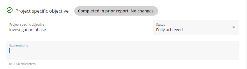 When the next Project report is created, all the items marked with “Fully achieved” in the previous submitted Project report receive a label with the wording “Completed in prior report. No changes.“ and all completed texts and other data shall be automatically pre-filled in the following report.