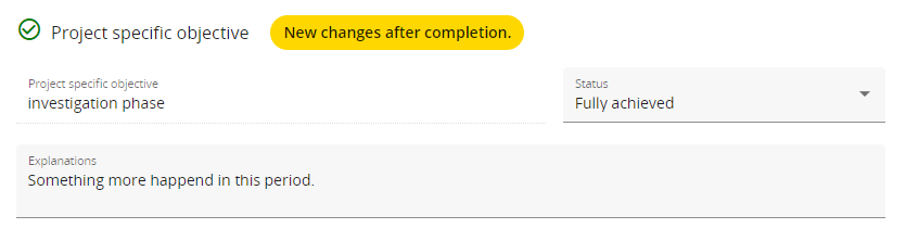 This label shall ensure that the project manager and the MA/JS know that the respective the Project specific objective, the Communication objective or an Activity was already previously completed and no changes were made. If the project manager changes the Status or revises data in an text or number field underneath the respective item, the label changes to “New changes after completion.”