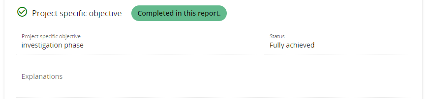 If the project manager selects for the Project specific objective, the Communication objective or an Activity the status “Completed in this report”, there is a label added to the respective item.