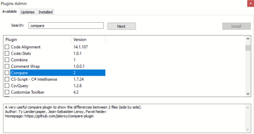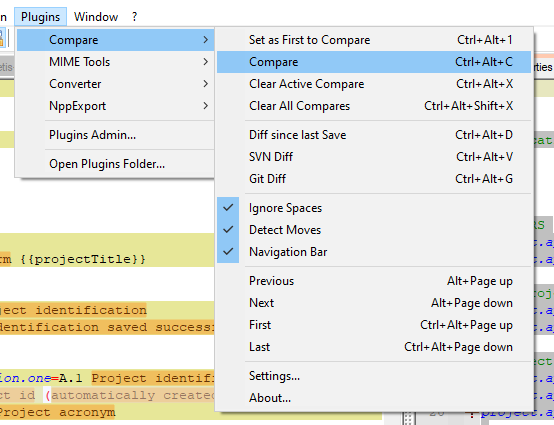Run the compare function by clicking Compare in the Plugins menu or use keyboard shortcut Ctrl+Alt+C