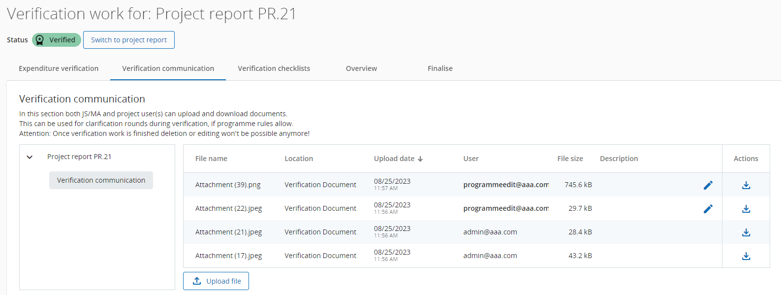 This section is quite unique in terms of privileges, as it is a shared file section, accessible to both programme users assigned to project and also partner user(s) (assigned via Project privileges). This section can be used to upload and download documents related to the verification of the project report.