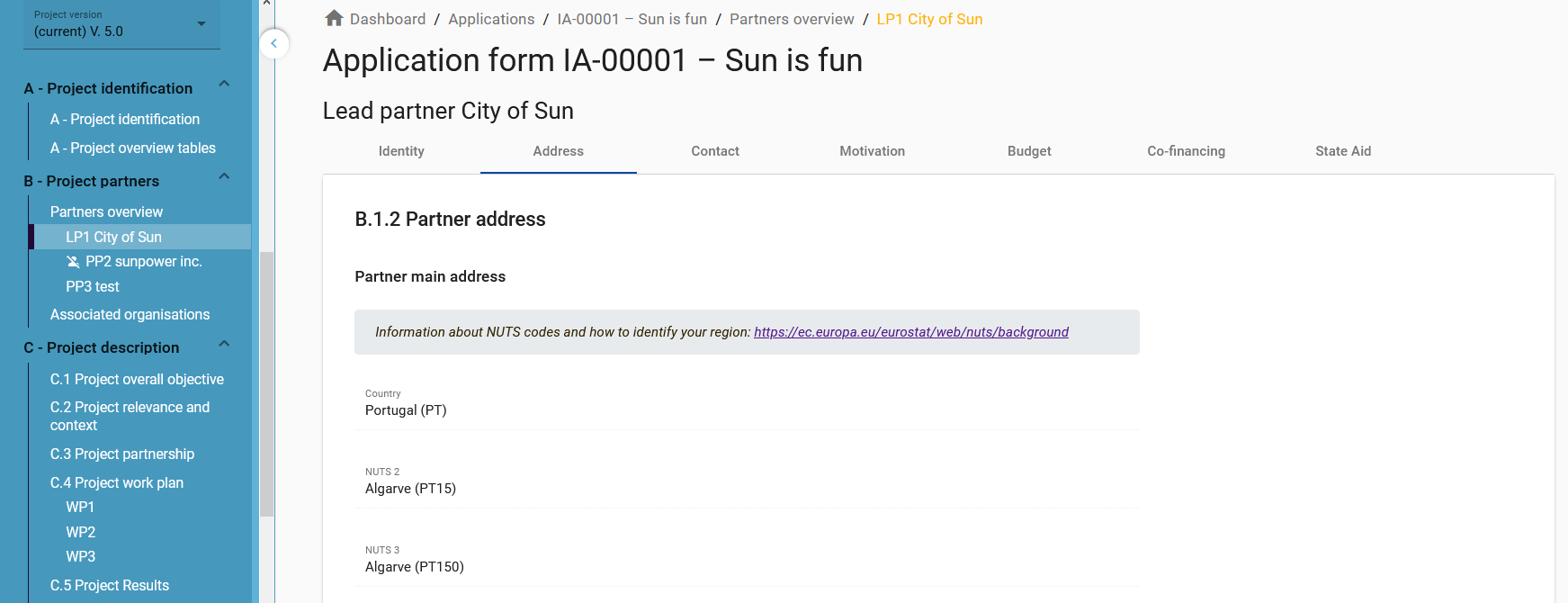 The partner geographical area is derived from the Application Form → section B.1.2 Partner Address