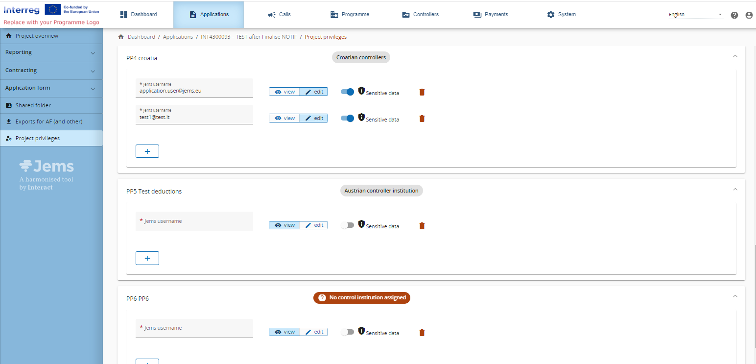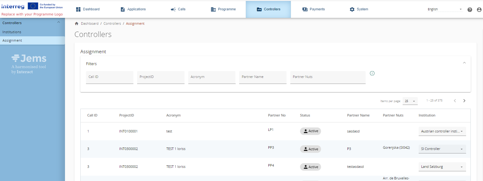The assignment of control institutions to project partners is performed in a dedicated page. There is a dedicated privilege to this page: