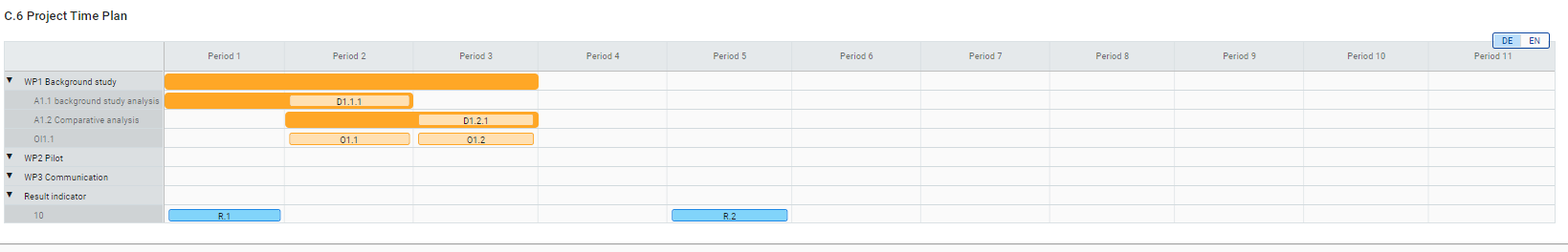 Project duration (Section A1) has to be filled in and periods have to be assigned to each item in order to be displayed on the timeline accordingly.